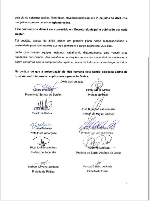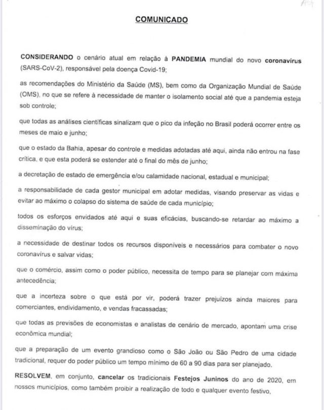 Além Itaberaba, a tradicional festa junina está cancelada, também, nas cidades de Senhor do Bonfim, Irece, Seabra, Miguel Calmon, Amargosa, Cruz das almas, Santo Antônio de Jesus, Piritiba e Ibicuí, que assinaram o comunicado.