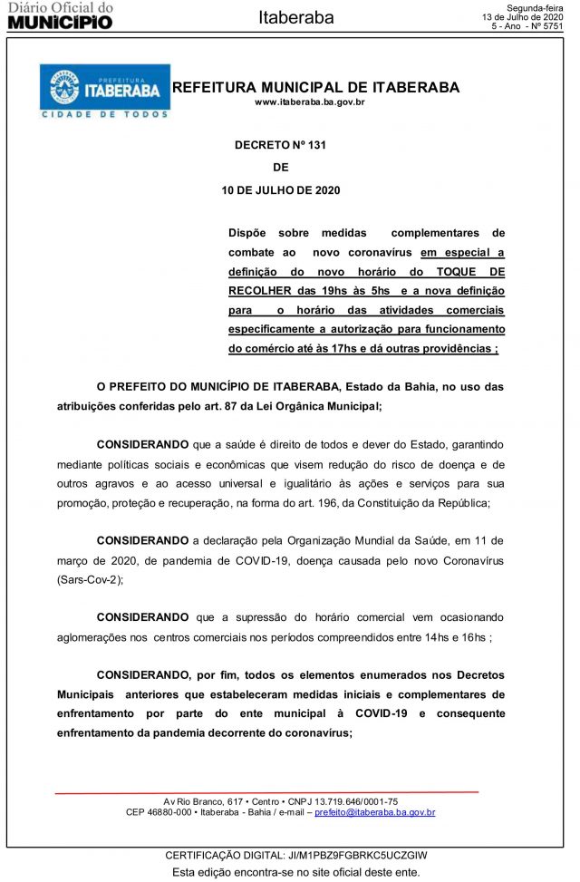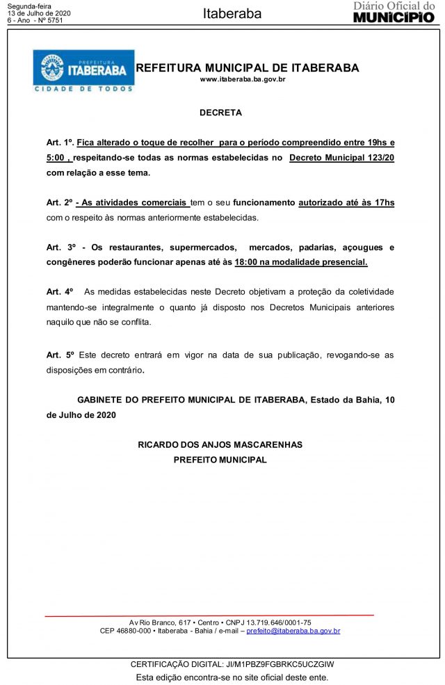 O prefeito Ricardo Mascarenhas, decretou nesta segunda-feira (13), o novo horário das atividades comerciais na cidade de Itaberaba.