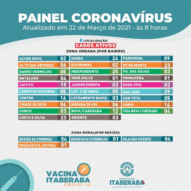 A Prefeitura de Itaberaba, por meio da Secretaria Municipal da Saúde, informa o boletim diário de segunda-feira (22) com dados consolidados até as 17h de domingo (21).