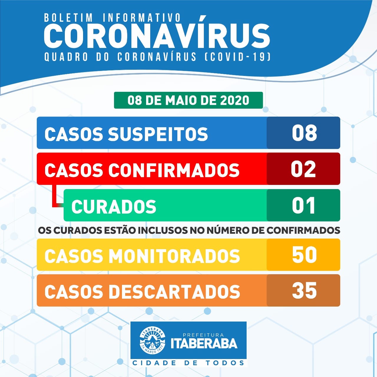 Ainda de acordo com o novo boletim, até o momento a cidade ja confirmou dois caos positivos, sendo que um deles já está curado. 35 casos foram descartados por exames e 50 pessoas estão em monitoramento.