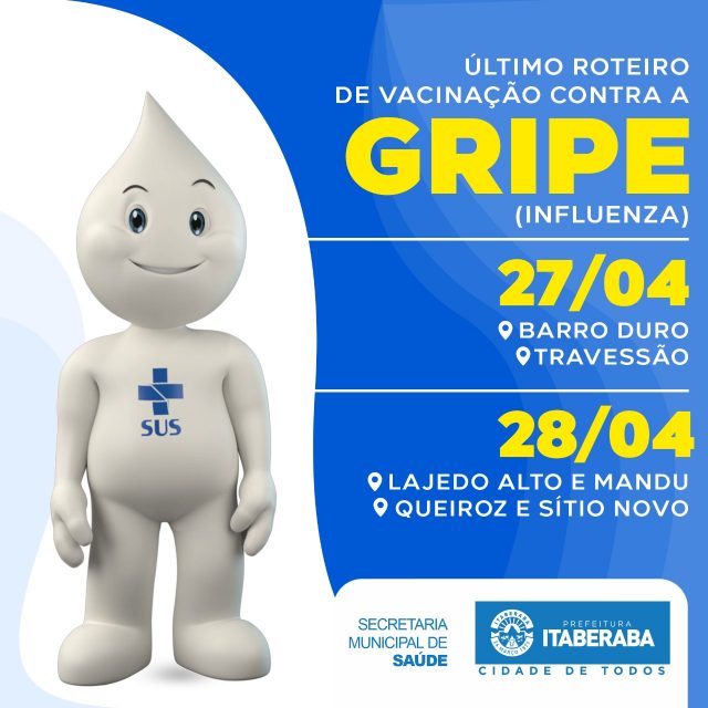 Nesta etapa — que vai até o dia 18 de maio — cerca de 45 localidades rurais deverão ser visitadas pelas equipes volantes, formadas por vacinadores e Agentes Comunitário de Saúde (ACSs) do Programa PACS. Segundo a Coordenação em Vigilância em Saúde, a vacinação nas localidades rurais está sendo realizada em todas as pessoas que integram os grupos prioritários da campanha. Confira, a seguir, a tabela com os Roteiros desta Etapa da Campanha na Zona rural de Itaberaba.