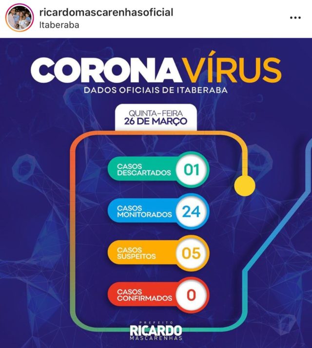 O prefeito Ricardo Mascarenhas divulgou nesta quinta-feira (26) o novo boletim diário sobre a evolução do coronavírus na cidade de Itaberaba.