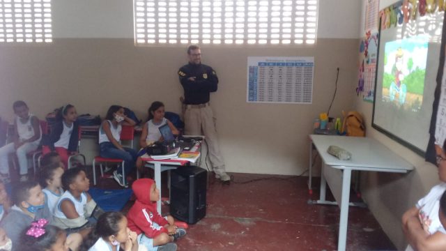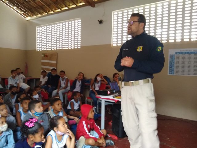Em mais uma atividade de Educação para o Trânsito, alunos da Escola Municipal Nelson Alves Guimarães Carvalho em Itaberaba receberam a visita de policiais rodoviários federais que conversaram sobre educação no trânsito.