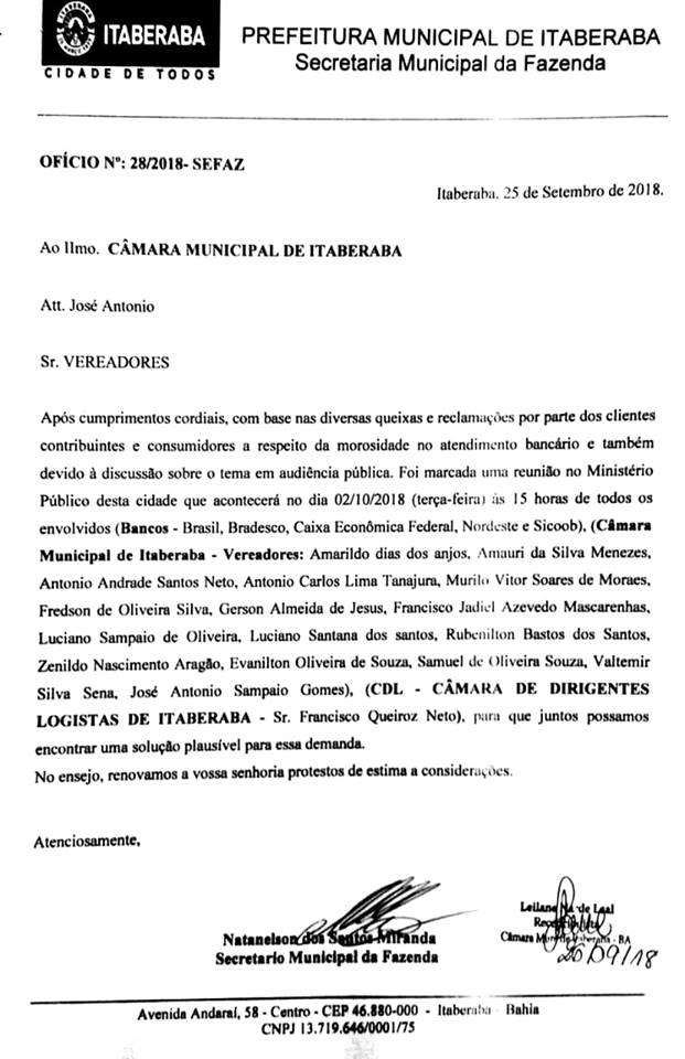 A Secretaria Municipal da Fazenda se reúne, na tarde de hoje (02) com a Camara de vereadores, Bancos e CDL no Ministério Publico para tratar da morosidade no atendimento nas agências bancárias em Itaberaba.