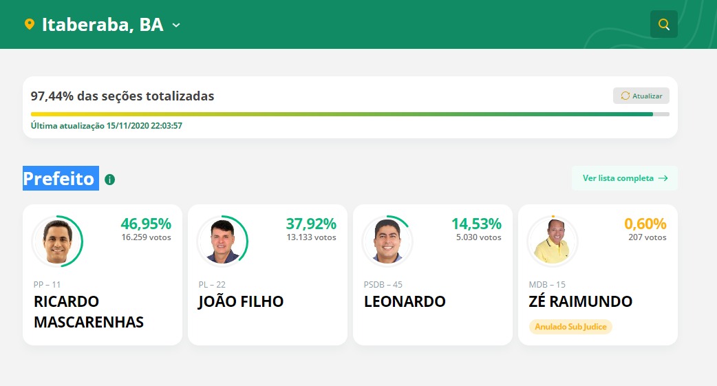 O Prefeito Ricardo Mascarenhas foi reeleito com uma diferença expressiva mais de 3.100 de votos na apuração parcial, para a prefeitura de Itaberaba.