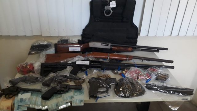 A Secretaria da Segurança informou que, com o sargento e os comparsas, foram apreendidos quatro revólveres calibre 38, uma pistola, três espingardas, carregador, munições, colete balístico, algema e celulares.