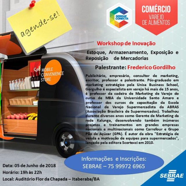 Itaberaba recebe nesta terça-feira, 5, o Workshop de Inovação com o tema “Estoque, armazenamento, exposição e reposição de mercadorias”, apresentado pelo palestrante Frederico Gordilho. Empresário, consultor de marketing e professor, Gordilho é especialista em varejo há mais de 15 anos, desenvolvendo também projetos e treinamentos em grandes redes varejistas nacionais e multinacionais. A programação compõe a agenda do Sebrae Conecta para o segmento do comércio de varejo de alimentos da região. O evento começa às 19h no auditório do Hotel Flor da Chapada.