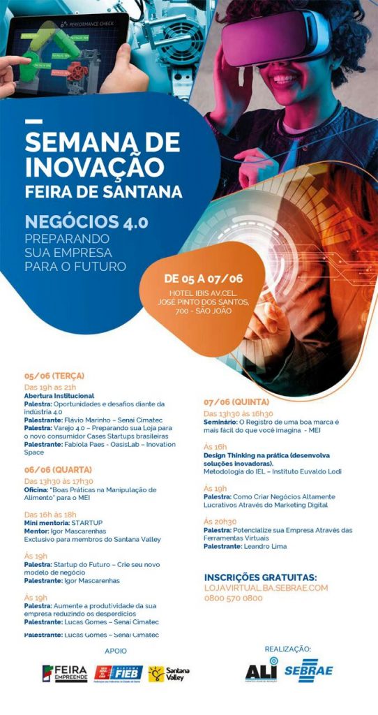 Com o tema “Negócios 4.0 – Preparando sua empresa para o futuro”, o Sebrae promove até o dia 7 de junho, em diferentes horários, mais uma edição da Semana de Inovação. Com seminários, oficinas e palestras, o evento irá apresentar soluções direcionadas a micro e pequenas empresas, para que possam acessar novos mercados. As capacitações serão realizadas no Hotel Ibis e estão disponíveis neste link. Produtividade e redução de desperdícios, registro de marca, marketing digital e ferramentas virtuais para potencializar negócios são alguns dos temas abordados no evento, contribuindo para promover o diferencial competitivo das organizações participantes.