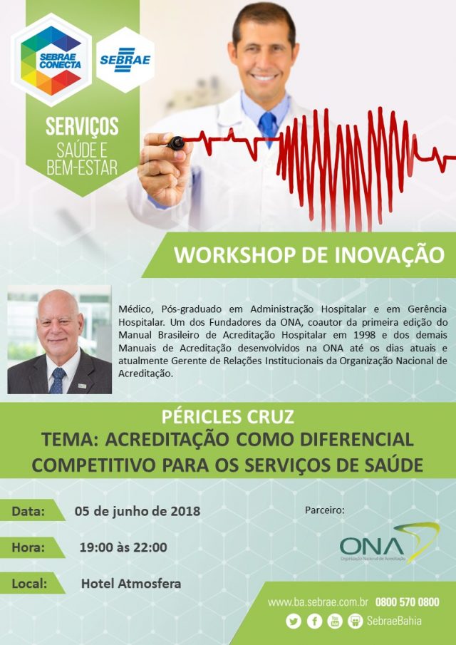 Hoje acontece um Workshop de Inovação voltado para empreendedores do segmento de Serviços – Saúde e Bem-Estar. Compondo as ações do Sebrae Conecta, o evento terá a palestra “Acreditação como diferencial competitivo para os serviços de Saúde”, apresentada por Péricles Cruz. O médico é pós-graduado em Administração Hospitalar e em Gerência Hospitalar e também é um dos fundadores da Organização Nacional de Acreditação (ONA). O encontro será realizado no auditório do Hotel Atmosfera, das 19h às 22h.