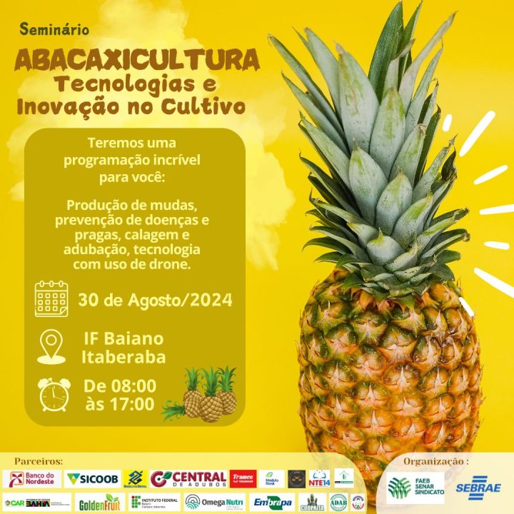 O Sebrae e o SENAR realizam, no próximo dia 30 de agosto, um grande evento voltado para todos os profissionais e entusiastas da abacaxicultura na cidade de Itaberaba. O Seminário da “Abacaxicultura: Tecnologias e Inovação no Cultivo em Itaberaba” acontece das 8h às 17h, na sede do IFBaiano, Campus Itaberaba, e promete ser inovador e repleto de conhecimento para toda a cadeia produtiva do abacaxi.