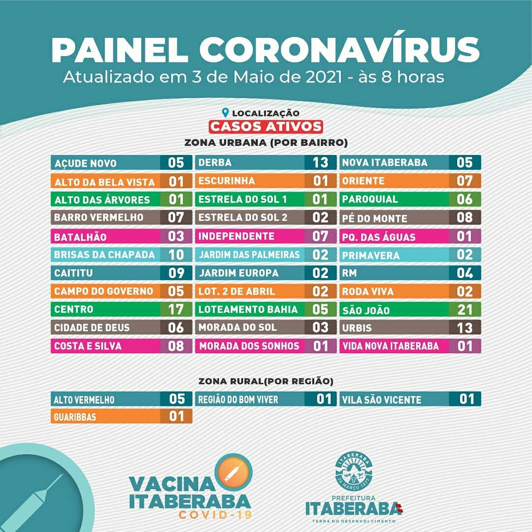 A Prefeitura de Itaberaba, por meio da Secretaria Municipal da Saúde, informa o boletim diário de segunda-feira (3) com dados consolidados até as 17h de domingo (2).