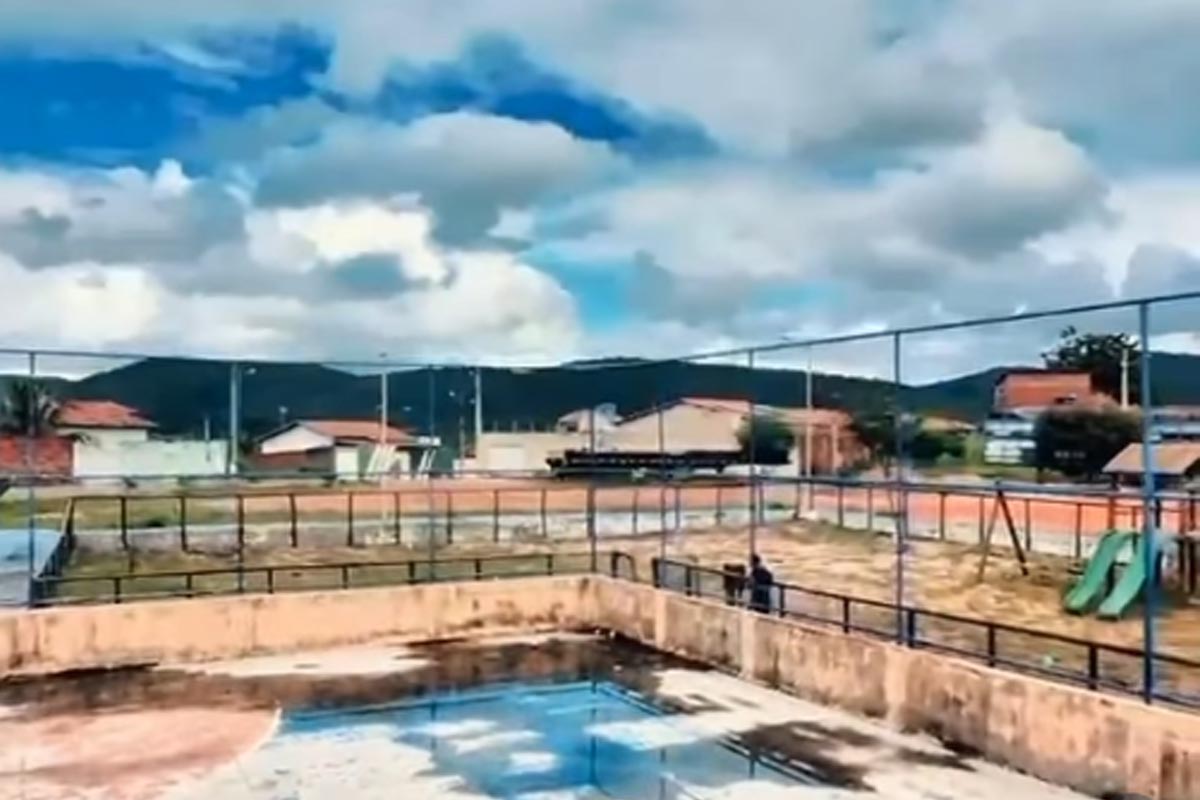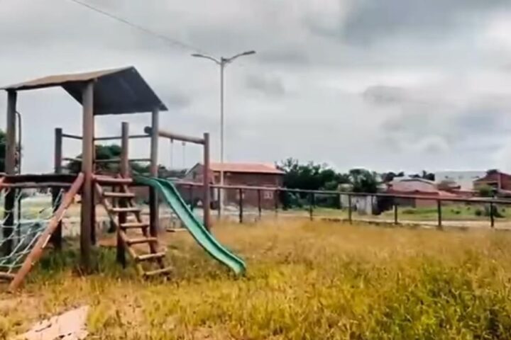 Nas imagens compartilhadas, é possível ver a vegetação tomando conta da quadra, brinquedos danificados e sinais claros de que o espaço não recebe cuidados há bastante tempo.