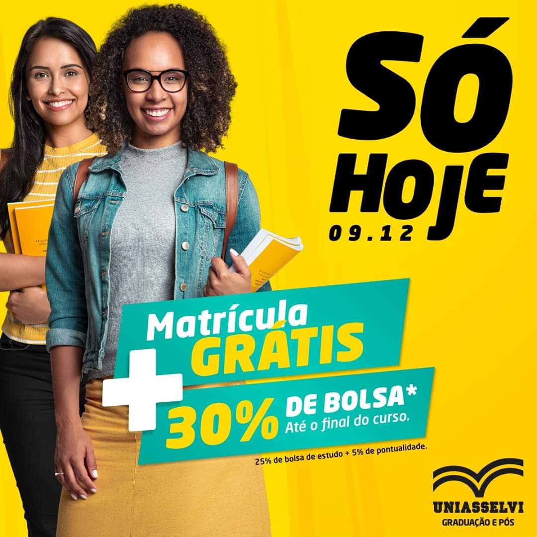 SÓ HOJE, você tem matricula grátis e bolsa de 30% até o final do curso, *conforme condições.