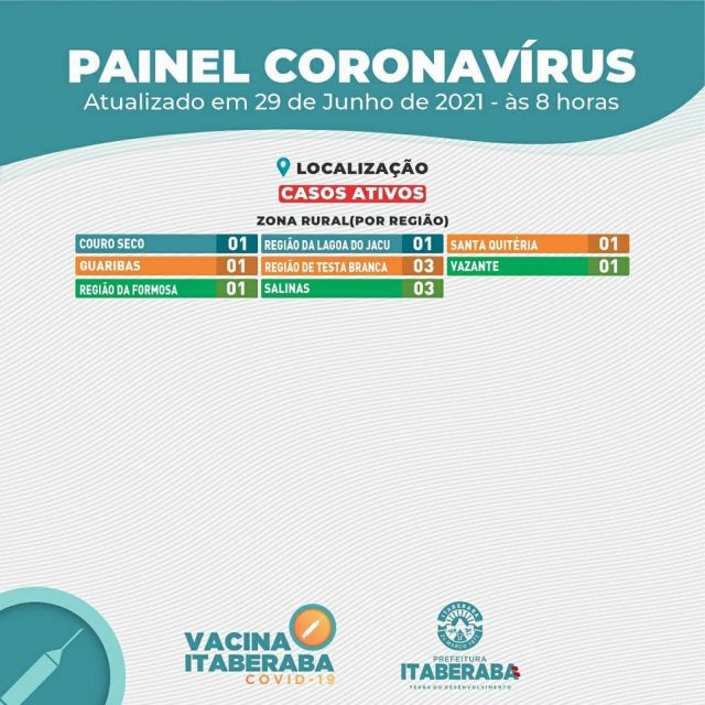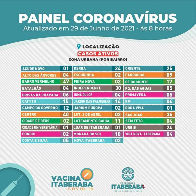 A Prefeitura de Itaberaba, por meio da Secretaria Municipal da Saúde, informa o boletim diário de terça-feira (29) com dados consolidados até as 17h de segunda-feira (28)
