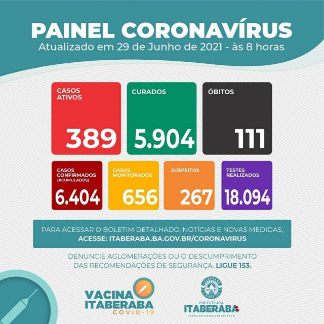 Atualmente Itaberaba tem 389 casos ativos, 267 casos suspeitos, 656 casos monitorados e 111 óbitos registrados pela doença. O número de casos curados é de 5.904 e, ao todo, já foram confirmados 6.404 casos da COVID-19 no município. Além disso, já foram realizados o total de 18.094 exames, dentre Testes Rápidos e RT-PCR/SWAB.