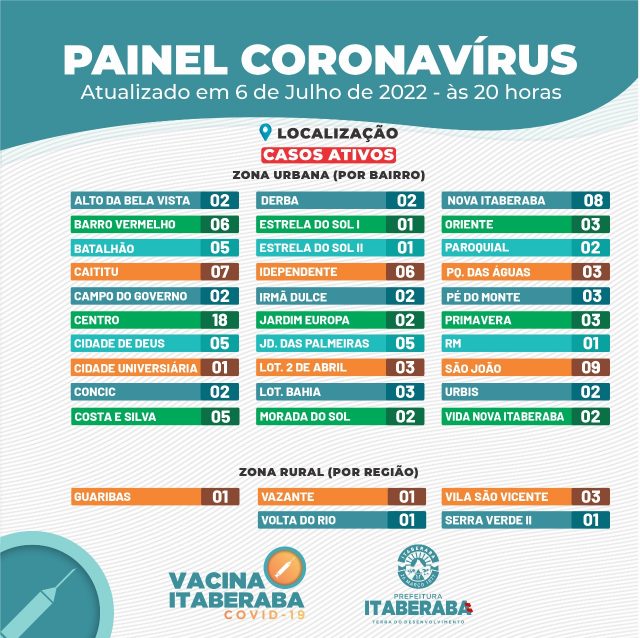 A Prefeitura de Itaberaba, por meio da Secretaria Municipal da Saúde, informa o boletim diário de quarta-feira (06) com dados consolidados até as 17h de terça-feira (05).