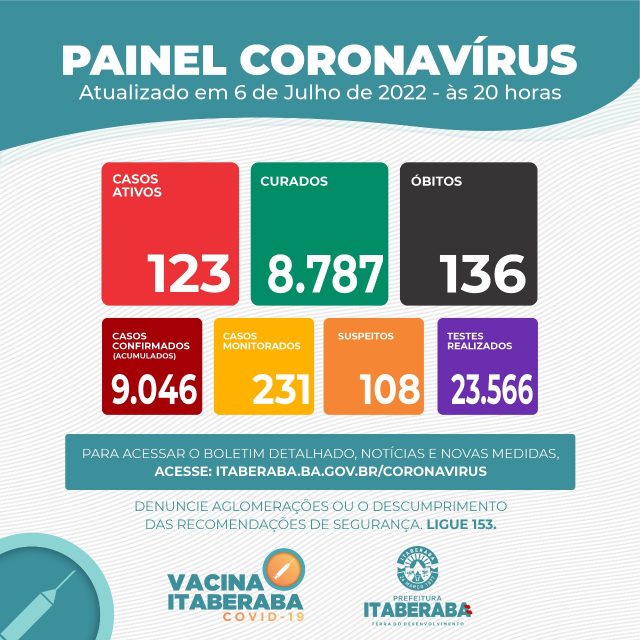 Atualmente Itaberaba tem 123 casos ativos, 108 casos suspeitos, 231 casos monitorados e 136 óbitos registrados pela doença. O número de casos curados é de 8.787 e, ao todo, já foram confirmados 9.046 casos da COVID-19 no município. Além disso, já foram realizados o total de 23.566 exames, dentre Testes Rápidos e RT-PCR/SWAB.