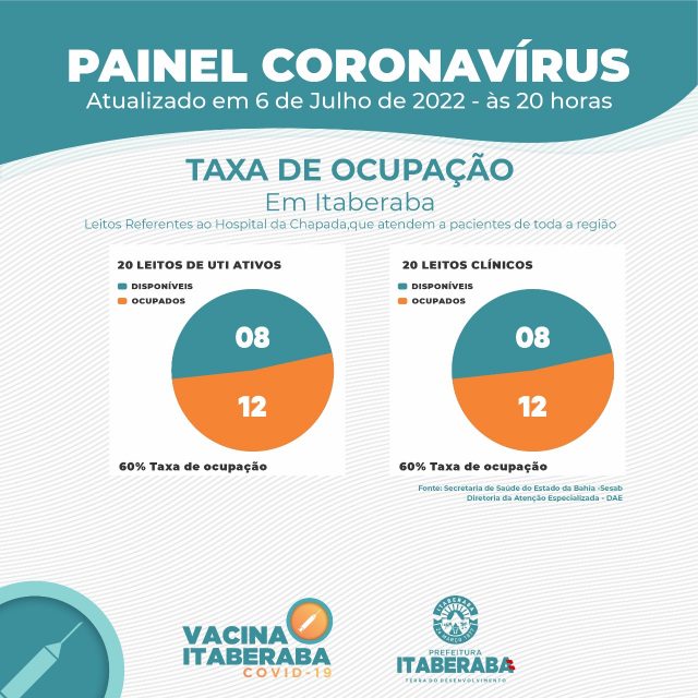 De acordo com o boletim diário de quarta-feira (06) e do Estado da Bahia – SESAB, atualmente os números da taxa de ocupação de leitos no município são: 20 Leitos Clínicos, 12 leitos ocupados, representando 60% de taxa de ocupação; 20 Leitos de Unidades de Terapia Intensiva – UTI, 12 leitos
