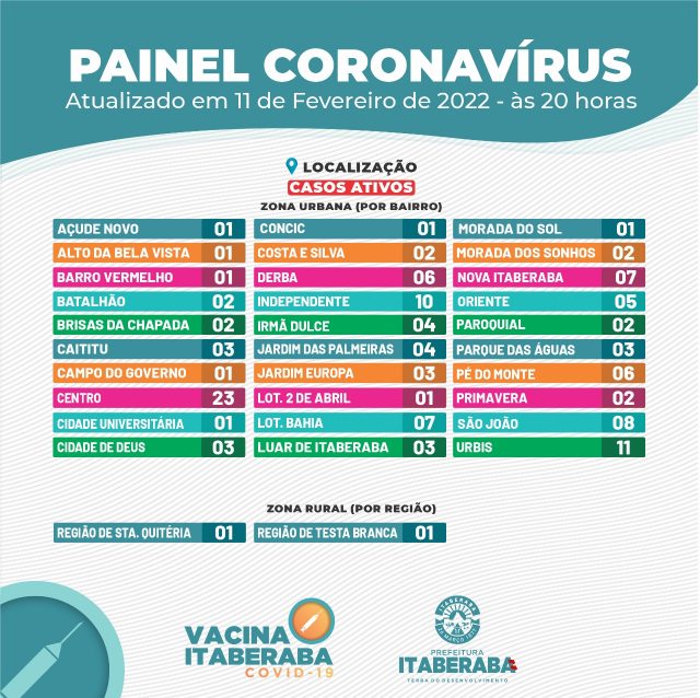De acordo com o boletim, atualmente Itaberaba tem 128 casos ativos, 192 casos suspeitos, 320 casos monitorados e 131 óbitos registrados pela doença.