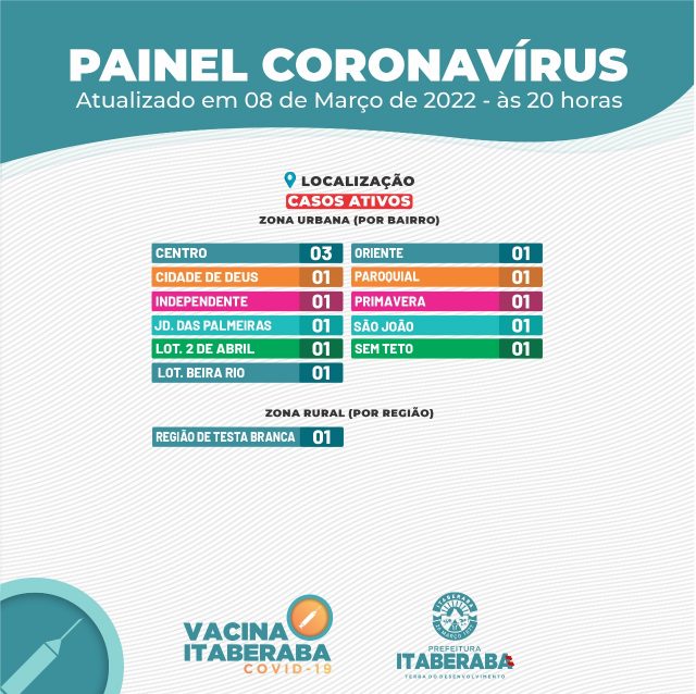 A Prefeitura de Itaberaba, por meio da Secretaria Municipal da Saúde, informa o boletim diário de terça-feira (08) com dados consolidados até as 17h.
