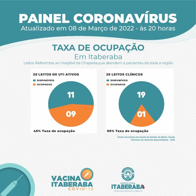 De acordo com o boletim diário de terça-feira (08) e do Estado da Bahia – SESAB, atualmente os números da taxa de ocupação de leitos no município são: 20 Leitos Clínicos, 01 leitos ocupados, representando 5% de taxa de ocupação; 20 Leitos de Unidades de Terapia Intensiva – UTI, 9 leitos ocupados, representando 45% de taxa de ocupação.