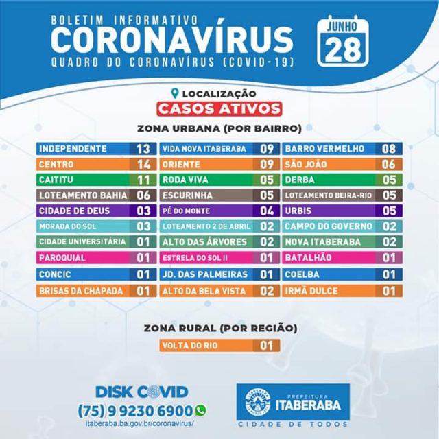 De acordo com o novo boletim, Itaberaba ja tem 250 casos confirmados, sendo 131 casos ativos, 107 curados e 12 óbitos.