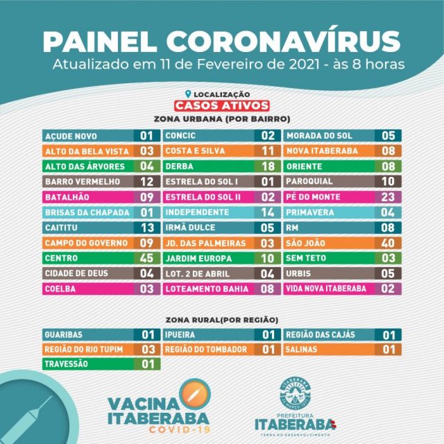 A Prefeitura de Itaberaba, por meio da Secretaria Municipal da Saúde, informa o boletim diário de quinta-feira (11), com dados consolidados até as 17h de quarta-feira (10).