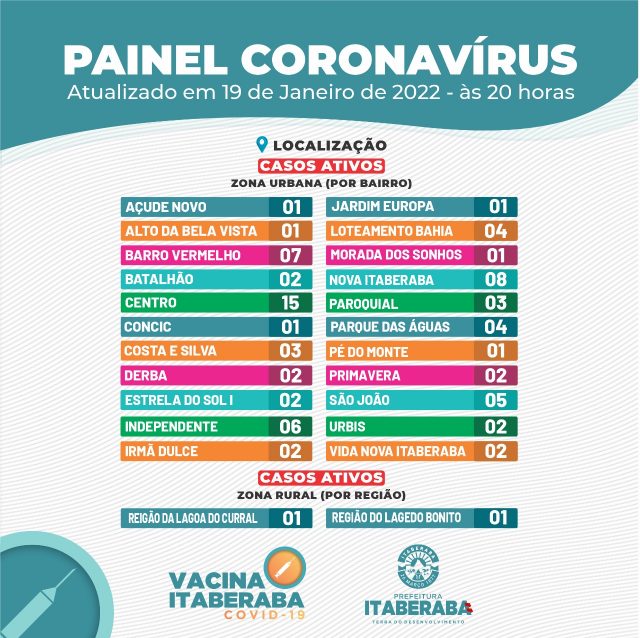 A Prefeitura de Itaberaba, por meio da Secretaria Municipal da Saúde, informa o boletim diário de quarta-feira (19) com dados consolidados até as 17h.
