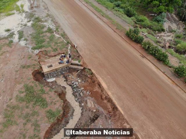 O local está sinalizado e corre risco de desmoronamento da pista devido à erosão causada pela enxurrada.