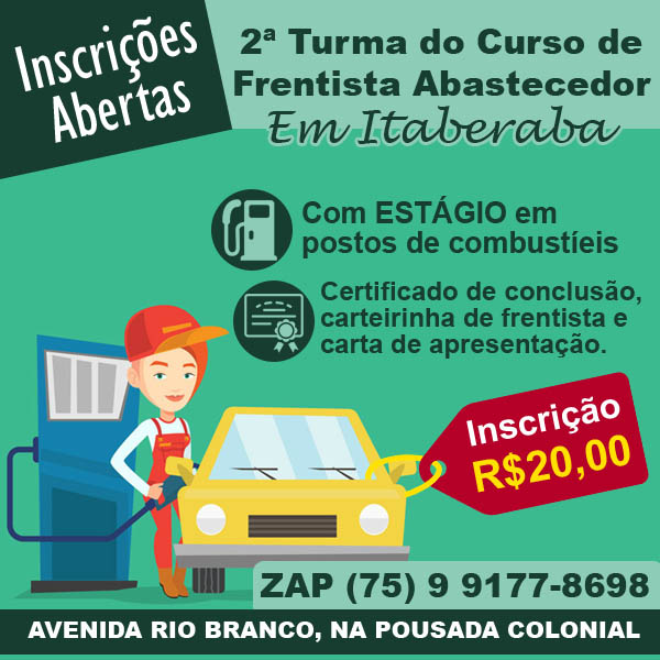 Ultimas vagas para o Curso de Frentista Abastecedor em Itaberaba. As inscrições estão sendo realizadas na Pousada Colonial, na Avenida Rio Branco, próximo à Secretaria Municipal de Educação.
