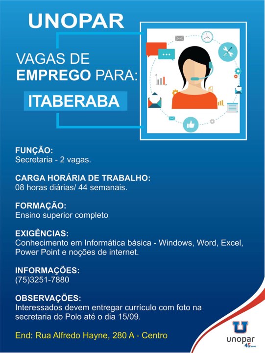 A Unipar está recebendo curriculos para preencher duas vagas para o cargo de secretária na cidade de Itaberaba.