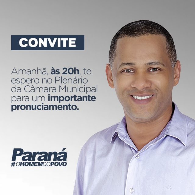 O vereador Zenildo Nascimento Aragão -Paraná (PP) convocou à população ao Plenário da Câmara Municipal para um importante pronunciamento.