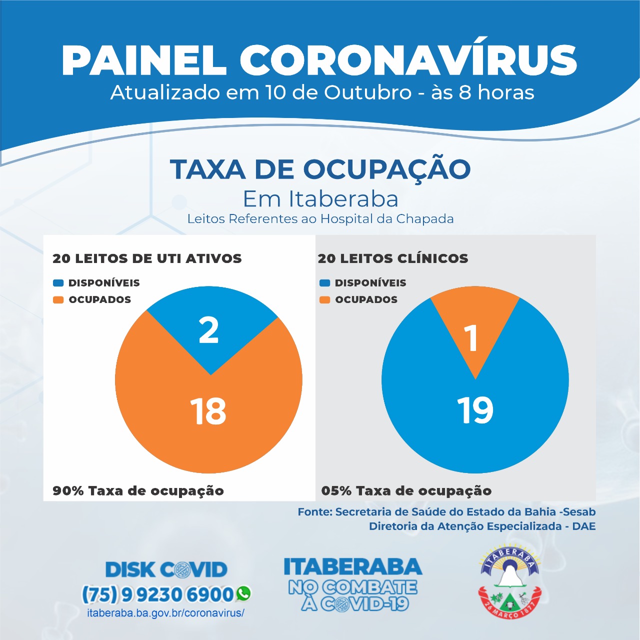 De acordo com o Boletim Oficial 10/10, até às 17h de sexta-feira (9), os números da Taxa de Ocupação de Leitos Clínicos e de Unidades de Terapia Intensiva (UTIs) no município, com dados da Secretaria da Saúde do Estado da Bahia (Sesab), são os seguintes: dos 20 LEITOS DE UTI ATIVOS, 18 estão ocupados; ao passo que, dos 20 LEITOS CLÍNICOS, 1 está ocupado atualmente.