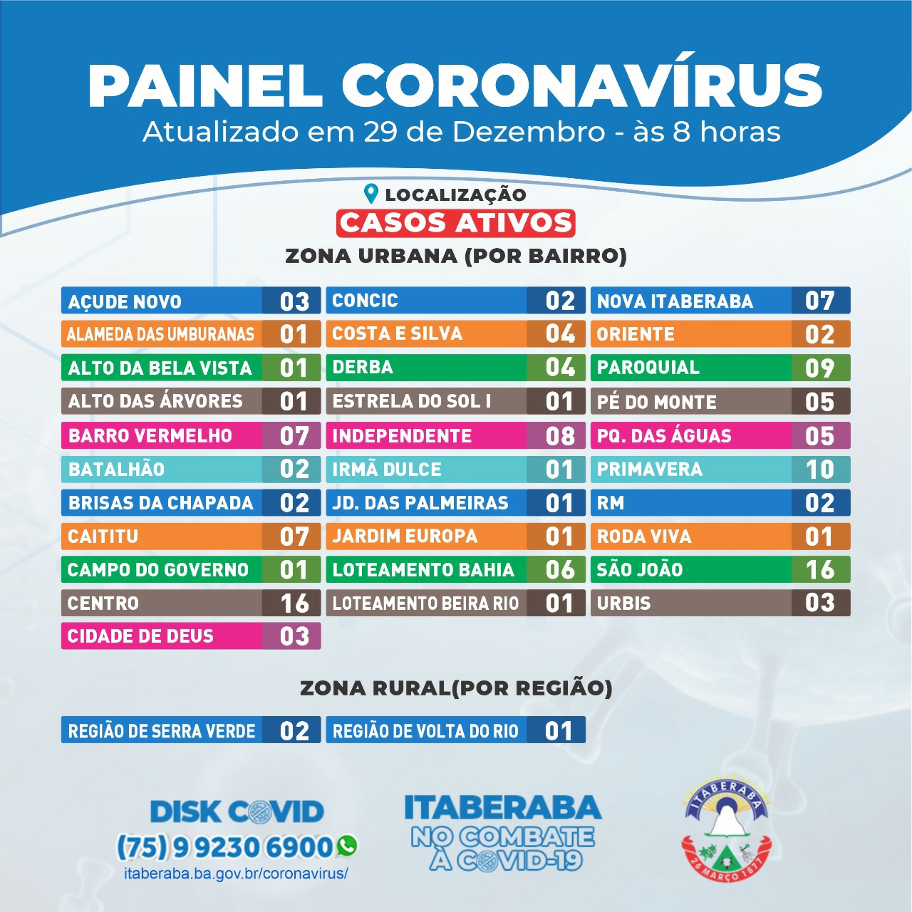 A Prefeitura de Itaberaba, por meio da Secretaria Municipal de Saúde (Sesau), assim como da Coordenação de Vigilância em Saúde e da Câmara Técnica (CT) de enfrentamento da pandemia do novo coronavírus, informa o Boletim Oficial 29/12 ㅡ com dados consolidados até às 17h de segunda-feira (28) ㅡ que registrou 16 novos casos da COVID-19.