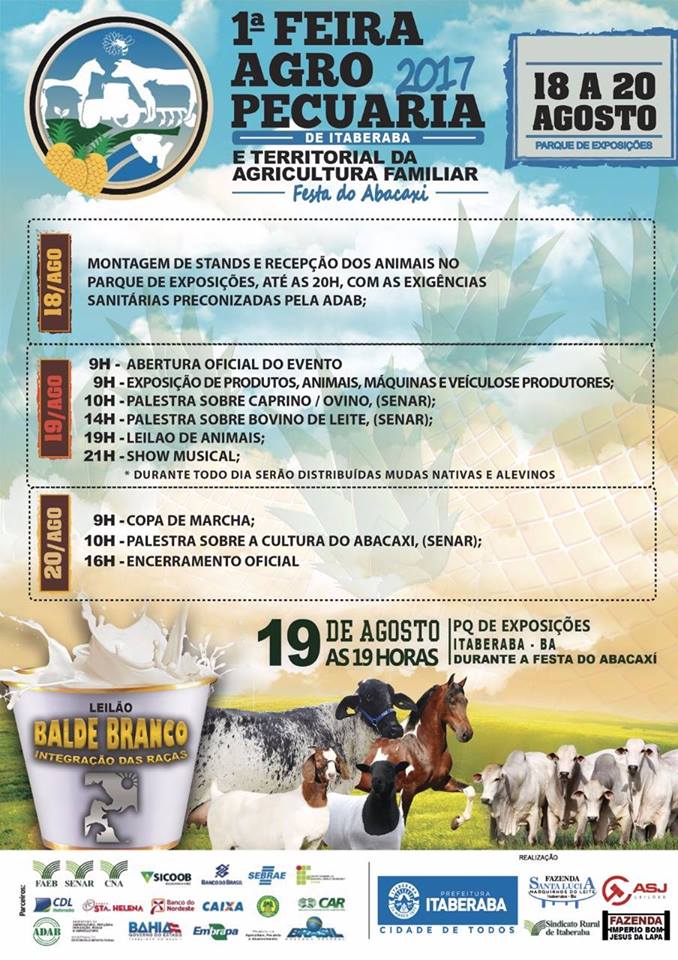 A Feira acontecerá no terceiro domingo de agosto que, por lei municipal, é o Dia do Abacaxi no município e terá como objetivo fomentar o comércio de animais e da produção agrícola familiar de Itaberaba e do Território Piemonte do Paraguaçu que reúne, ainda, outros 13 municípios.