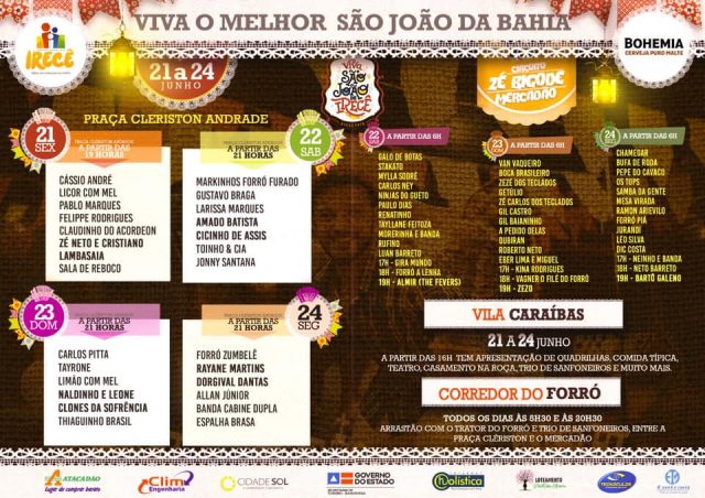 Zé Neto e Cristiano, Amado Batista, Dorgival Dantas e Lambasaia estão entre as atrações da festa junina de Irecê, no norte da Bahia, entre 21 e 24 de junho. A festa é gratuita e acontece na Praça Cleriston Andrade.